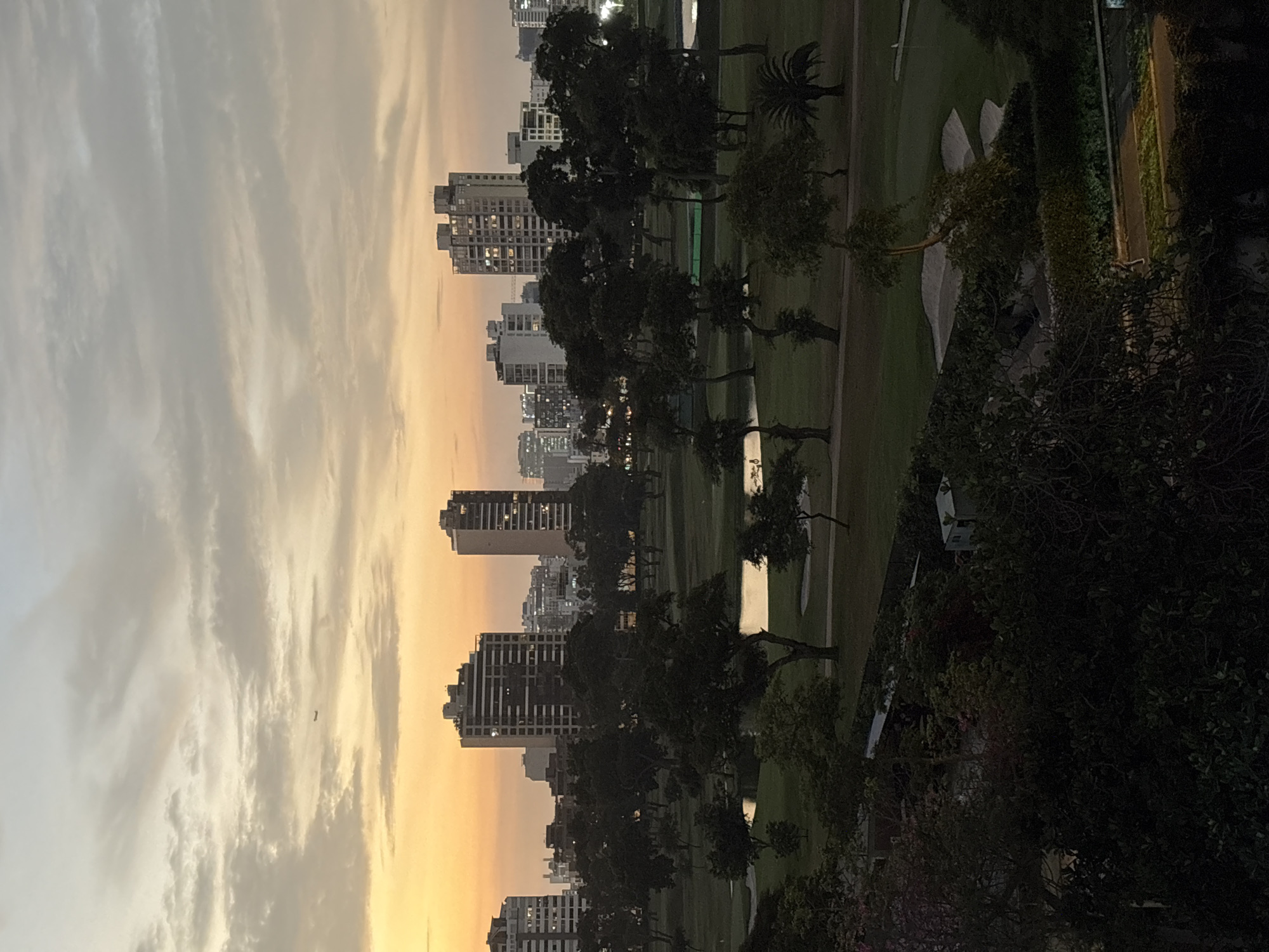 The image depicts a cityscape at twilight in San Isidro, Peru. Tall buildings line the horizon, silhouetted against a sky with pale, cloud-streaked light transitioning from white to orange. A green golf course stretches from the lower right of the frame towards the center, punctuated by trees and bunkers. Lush vegetation frames the right side of the image. The viewpoint is elevated, likely from a high-rise building. No people are visible.