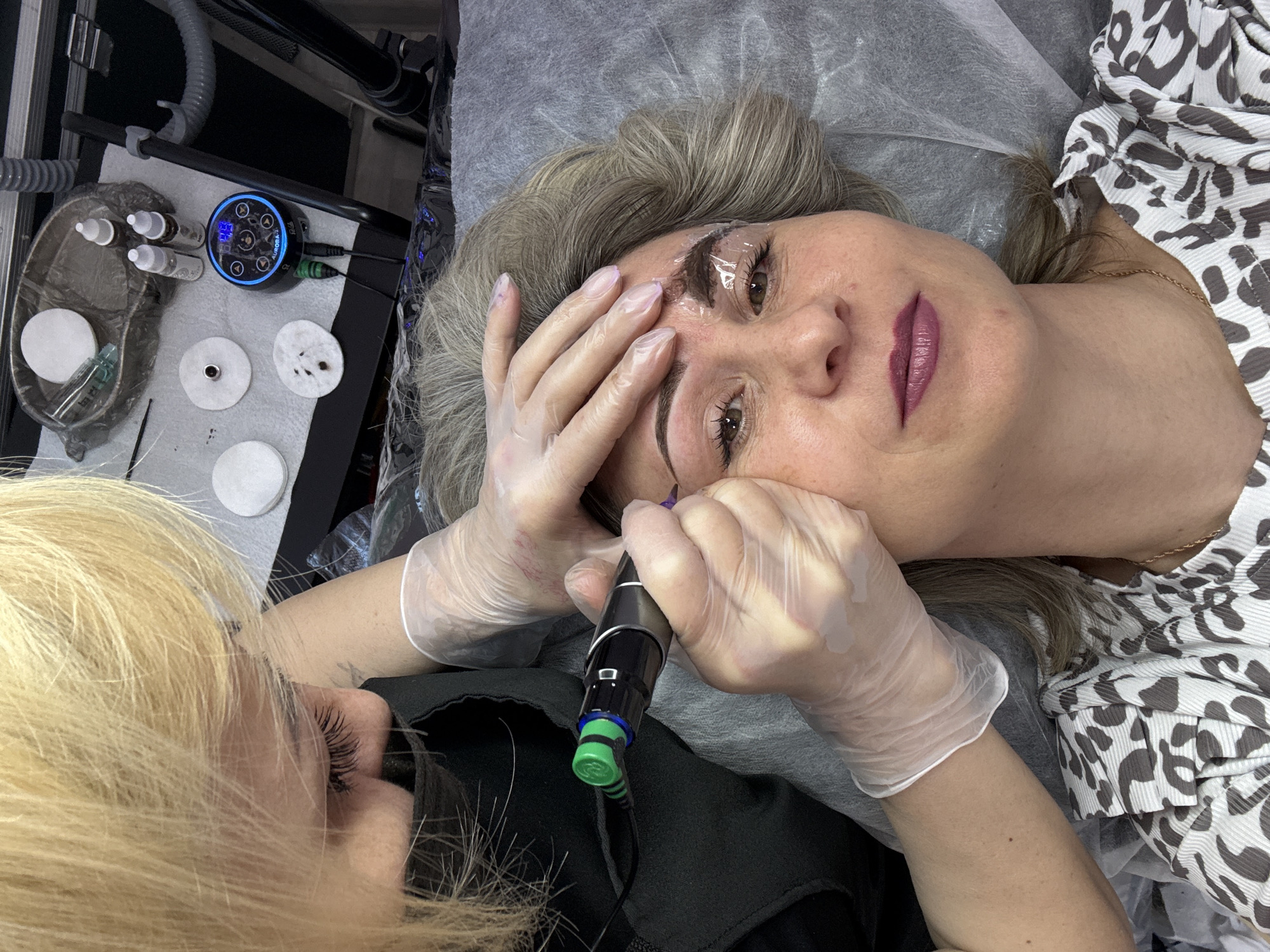 A woman lies on a table with a gray covering. She is receiving a cosmetic procedure on her eyebrows. A gloved hand holds a tattoo-like machine with a green adjustment ring, and a wire trailing to the left. Clear plastic covers her eyebrows. Another person, with blonde hair, is operating the machine. To the left, a black tray holds cotton pads, small bottles, and a digital machine. The woman wears a white and gray patterned shirt and a thin gold chain around her neck. The location appears to be a salon, possibly in Bolsheustyikinskoye, Russia.