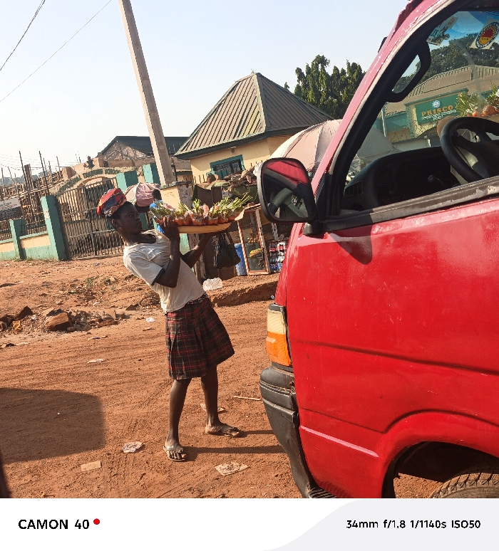 A person wearing a white shirt and plaid skirt carries a tray of food on their head while standing in front of a red van. The ground is reddish-brown dirt. A building and fence are visible in the background, along with utility poles. The scene appears to be in an outdoor urban area.