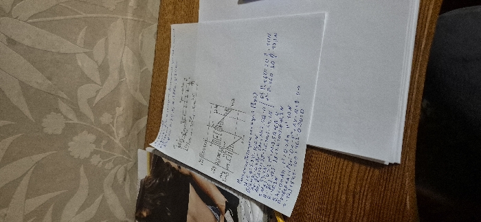 The scene, located indoors in the city of Tompsan, Bulgaria, depicts a wooden surface, likely a desk or table, occupying the lower frame. Centrally positioned on this surface is a stack of white papers. The topmost sheet contains handwritten content in dark ink, comprising mathematical calculations, a technical diagram with geometric shapes and labeled points, and text in Bulgarian. To the immediate left of the paper stack, a segment of a glossy magazine or book cover is visible, depicting a female subject with dark hair. The upper portion of the image reveals a wall covered in light-colored wallpaper featuring a repeating pattern of stylized floral and leaf motifs. A dark, indistinct object is present in the bottom right corner, partially obscured by the paper stack.