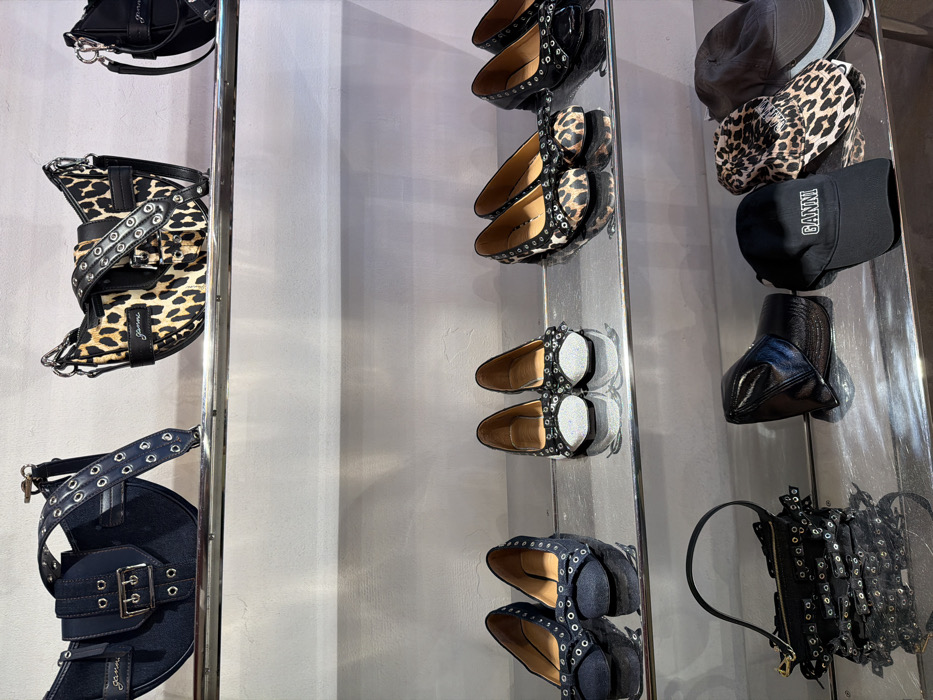 This image captures a retail display within a GANNI store, located in Copenhagen, Denmark