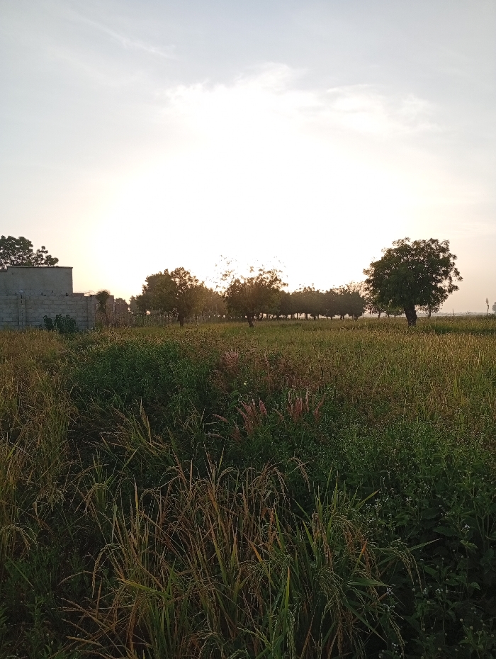 A field of tall grasses and vegetation dominates the foreground, with some brown, rice-like plants visible. In the midground, a line of trees stretches across the landscape. A building with a visible roofline stands to the left. The sky is bright, suggesting either dawn or dusk, with light clouds. The overall scene evokes a sense of rural serenity.