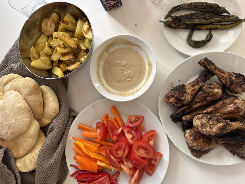 A high-angle forensic shot depicts a meal laid out on a white surface in Erba, Italy. No individuals are present. In the upper left quadrant, approximately eight circular pita bread pieces are stacked on a dark grey waffle-weave textile. To the immediate right, a stainless steel bowl contains numerous roasted potato wedges, some exhibiting browning. Below the pita bread, a white circular plate holds an arrangement of sliced red bell pepper strips, orange bell pepper or carrot strips, and sliced red tomatoes. Adjacent to this vegetable plate and below the potato bowl, a smaller white circular bowl contains a light brown, creamy sauce. Below the sauce bowl, a large white circular plate presents multiple grilled chicken drumsticks with visible char marks, layered over what appears to be grilled flat pieces of meat. To the right of the chicken plate, a smaller white circular plate displays several grilled green peppers, some appearing blistered. A transparent drinking glass is partially visible on the upper right, beside the potato bowl.