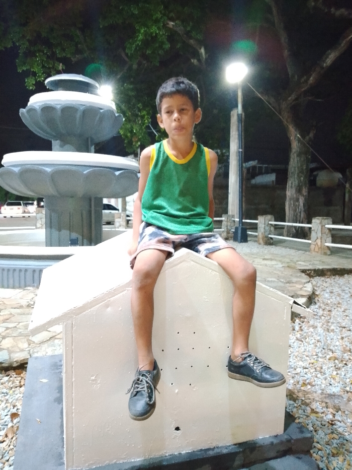 A young boy sits atop a white, house-shaped structure in an outdoor setting at night. He wears a green tank top with yellow trim, patterned shorts, and lace-up shoes. In the background is a tiered fountain, a streetlight, and trees under a dark sky. The ground is covered in small rocks. The scene is lit by artificial lights, creating shadows and highlights.