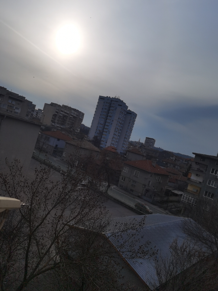 An outdoor, slightly tilted, elevated perspective captures a section of the city of Targovishte, Bulgaria, under a bright, partially overcast sky. The prominent sun is located in the upper-left quadrant, emitting a strong glare and creating a bright, washed-out appearance in that area, transitioning to a light-blue and grey-blue sky towards the upper right. The immediate foreground, particularly the lower left, displays a light-colored, angular structural element. The lower half of the image is significantly framed and partially obscured by a dense network of dark, bare deciduous tree branches, indicating a dormant vegetative state. In the midground, an asphalt or paved road is visible, traversing horizontally. A single dark-colored vehicle is parked on this road. Adjacent to the road, several low-rise residential buildings, typically 2-3 stories, are present, featuring grey facades and pitched, reddish-brown tiled roofs. A large, grey, corrugated metal roof structure occupies the lower-mid right portion of the frame, partially visible through the foreground trees. The background is dominated by multi-story urban architecture. A prominent light-blue or light-grey residential tower, approximately 10-12 stories high with numerous visible windows, stands slightly right of the vertical center. To its left, a cluster of older, darker multi-story apartment blocks, estimated to be 5-8 stories high, are discernible. Further in the distance, additional buildings and a slender, dark spire-like structure rise above the general skyline. No human figures are clearly identifiable. Small, dark specks, consistent with distant birds, are visible in the sky.
