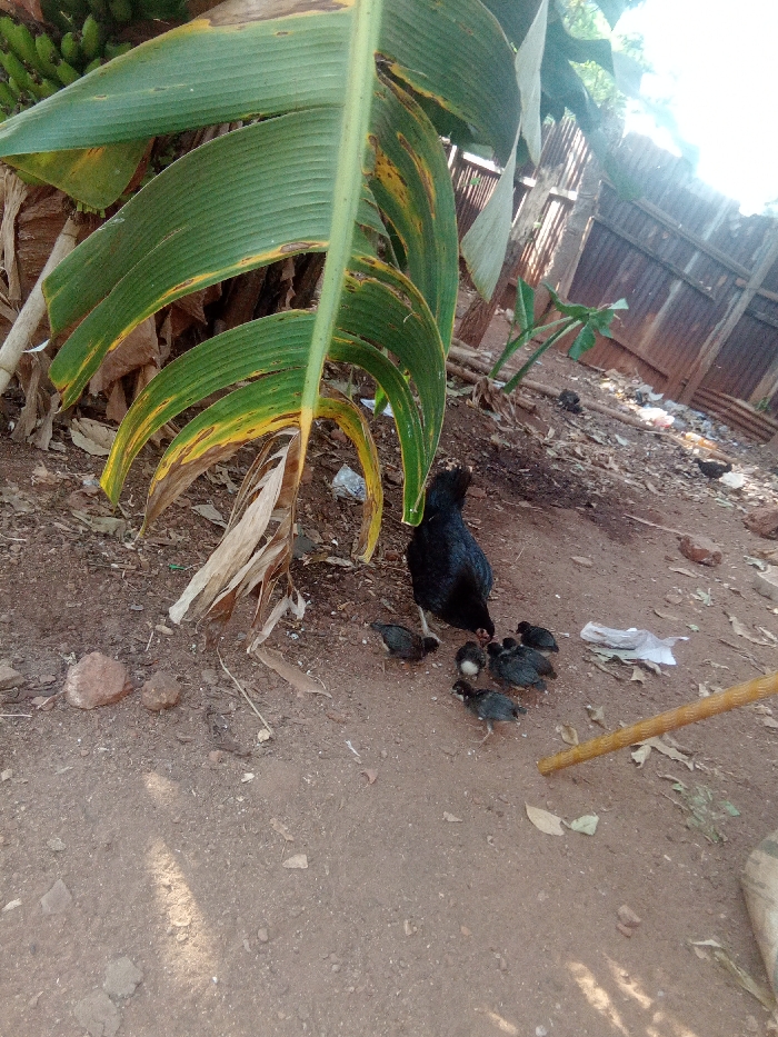 - "The scene in Nsukka, Nigeria, displays a black hen with approximately seven black chicks on dry, reddish-brown earth" by FM-DTpu02, licensed under CC BY 4.0