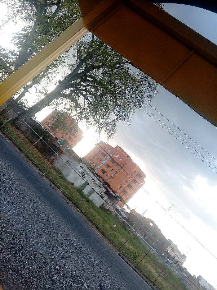 A tilted perspective captures an urban landscape under a cloudy sky. Two salmon-colored buildings dominate the background, contrasting with the greenery and chain-link fences in the midground. A weathered street is visible in the foreground. Part of a yellow structure frames the shot, possibly a bus shelter. A large tree with full foliage stands to the left, adding a natural element to the urban setting. Electrical wires stretch across the sky.