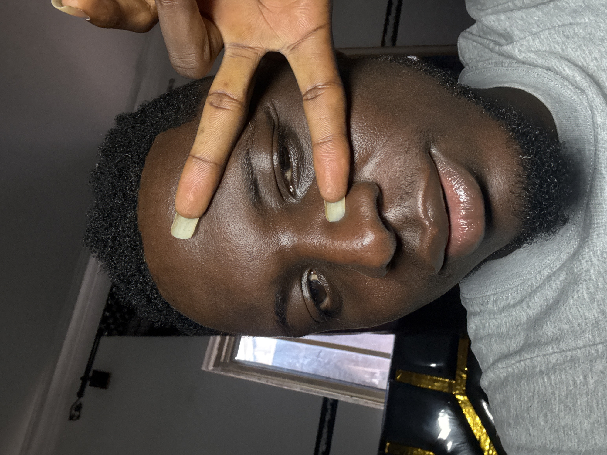 The image captures a close-up, frontal portrait of a dark-skinned individual in an interior setting in Lafia, Nigeria. The individual, identified as male, has short, dark, curly hair and a short, dark beard along the jawline and chin. He is wearing a light grey crew-neck t-shirt. The individual's left hand is raised, with the index and middle fingers extended in a peace sign (V-sign), partially obscuring the right side of his face, including the right eye and temple area. The fingernails on these two fingers are long and painted a pale yellowish-green. The visible left eye is dark brown and directed towards the camera. The lips are full and appear glossy. The skin on the face exhibits a noticeable sheen. The background features a rectangular window frame on the right side, admitting bright natural light. Below the window, a dark object with horizontal gold reflective accents is visible. Above the individual's head, a dark, thin rod with a small, dark rectangular attachment extends horizontally across the upper background against a light-colored wall and ceiling.