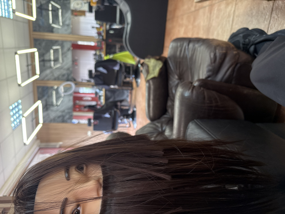The image depicts the interior of a hair salon or barbershop located in Plovdiv, Bulgaria. In the immediate foreground, the upper half of a human-like head, possibly a mannequin or person, is visible. This head features dark eyes and eyebrows, with long, dark brown hair falling forward, obscuring the lower face, chin, and mouth, presenting an appearance of layered or unevenly cut hair. Directly below this head, a dark, possibly black, chair or object is present. To the right, a dark brown, worn leather armchair is visible, with a crumpled light-colored fabric resting on its backrest. In the bottom right corner, a portion of a person's leg, clad in dark pants and a dark shoe, is visible, suggesting the perspective of someone seated. The background reveals a salon environment with multiple styling stations. Each station includes a dark barber or styling chair with a chrome base, some draped with black capes. Walls feature alternating vertical light-colored wooden panels and darker, possibly marbled, panels with mirrors. Hints of red elements are visible further within the space. The ceiling is equipped with several bright, square and rectangular fluorescent light fixtures. No overt actions or interactions between individuals are discernible.