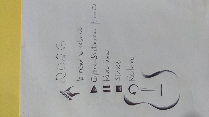 A white sheet of paper, bearing hand-drawn black ink illustrations and text, is depicted against a yellow background at the top. The paper exhibits minor smudges and discoloration. The drawn elements include the number "2026" in the upper right quadrant. Below this, the French phrase "la mémoire collective" is written. Further down, the English phrases "Capture Spontaneous Moments," "Real Time," "STAKE," and "Redeem" are listed vertically. To the left of "2026," a stylized foot or paw print with five circular toes is drawn. A right-pointing triangular play symbol is positioned next to "Capture Spontaneous Moments." A double vertical bar pause symbol is next to "Real Time." A solid square stop/record symbol is next to "STAKE." In the lower-left portion of the paper, the outline of an acoustic guitar is drawn. Within the guitar outline, a circular arrow symbol, three vertical lines, and a single horizontal line resembling a bridge are depicted. No individuals are present. The scene is located in Longuo 'A', Tanzania.