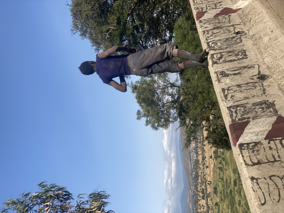 A young Black man, wearing a purple t-shirt and grey pants, stands on a concrete barrier in Iringa, Tanzania
