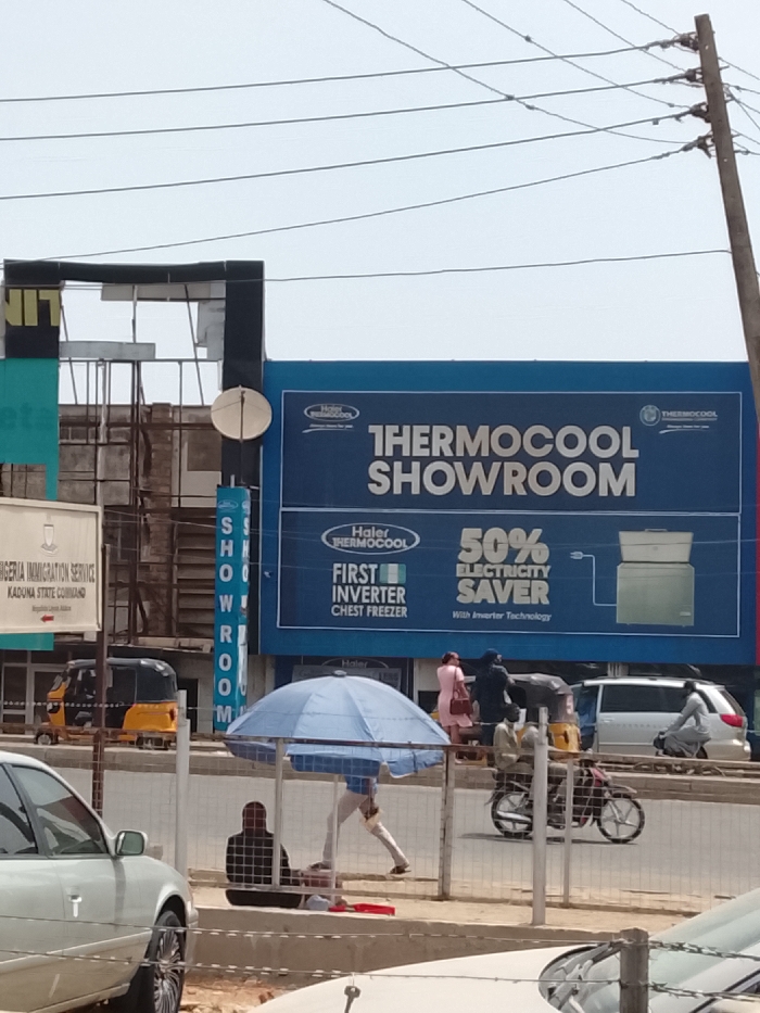 This image depicts a busy street scene during daytime, attributed to the city of Maiburiji, Nigeria, although a prominent sign visible on the left side of the road identifies "NIGERIA IMMIGRATION SERVICE KADUNA STATE COMMAND Rigachikun Layout, Kaduna". The foreground is partially occupied by the front left fender and tire of a silver car, and the hood of a white car on the right. A low metal fence with vertical bars separates the immediate foreground from a sidewalk. In the midground, a light blue umbrella is set up on the sidewalk, shading a person seated on the ground. Another person walks past the umbrella, visible from the waist down in light-colored pants. Beyond the sidewalk, a paved road carries vehicle and pedestrian traffic. A yellow tricycle (Keke Napep) is visible on the left side of the road, and a white minivan is further right. A person on a motorcycle, wearing dark clothing, rides towards the right. The background features several structures. On the left, a multi-story building frame is partially visible next to the "NIGERIA IMMIGRATION SERVICE" sign. Adjacent to this, a large blue billboard dominates the scene, advertising "THERMOCOOL SHOWROOM" in white capital letters. Below the main "THERMOCOOL SHOWROOM" text, another section of the billboard promotes "Haier THERMOCOOL FIRST INVERTER CHEST FREEZER 50% ELECTRICITY SAVER With Inverter Technology", displaying an illustration of a chest freezer. Below this billboard, a vertical sign reads "SHOWROOM". Two individuals, one in a light pink dress carrying a handbag and another in dark attire, are visible walking on the sidewalk in front of the showroom. A wooden utility pole with multiple overhead power lines stands on the far right. The sky above is clear and bright.
