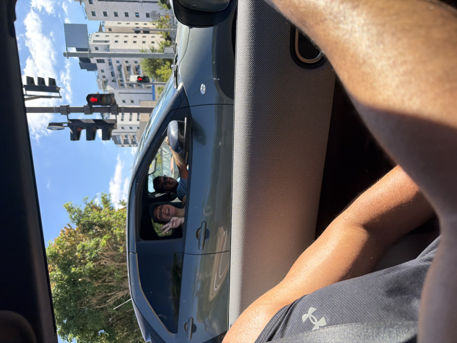 The image depicts a daytime urban street scene in Raanana, Israel, under a clear blue sky. The view is captured from inside a vehicle, looking towards an adjacent vehicle stopped at a major intersection. In the foreground, the lower right portion of the image shows the tan-skinned forearms and partial torso of an individual, presumably the photographer, wearing a grey short-sleeved shirt with an "Under Armour" logo visible on the left side of the chest. The textured light-grey interior paneling of the photographer's vehicle door is also visible. In the midground, to the right of the photographer's vehicle, a dark grey compact hatchback or SUV is stopped. Inside this vehicle, two occupants are visible. The male driver, positioned on the left side of the vehicle, wears a light-colored t-shirt and sunglasses, smiling towards the photographer. The female front passenger, to the driver's right, wears a dark cap and a light-colored top. She is smiling broadly and extending her right hand towards the photographer, displaying a "peace sign" (V-sign) with her fingers. Both individuals appear to be interacting directly with the photographer. The background reveals a bustling urban environment. A tall metallic pole with multiple red vehicular traffic lights and a red pedestrian 'standing man' signal is prominent, indicating that traffic is stopped. Behind the traffic lights, several modern, multi-story (approximately 6-8 stories), light-colored residential apartment buildings are visible. These buildings feature multiple windows and balconies, characteristic of contemporary Israeli urban architecture. On the far left, green foliage from mature trees is present. The road surface is asphalt. The location is a major intersection along **Ahuza Street in Raanana, Israel**, identifiable by the specific style of modern residential buildings and urban infrastructure common to that area.