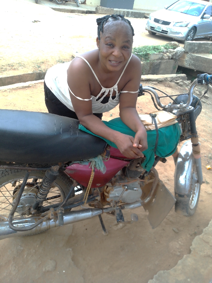In Lagos, Nigeria, an adult female is depicted smiling directly at the camera while leaning against a utilitarian motorcycle