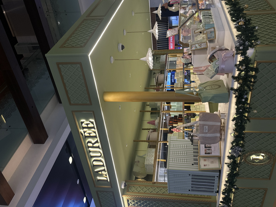 A Ladurée store features a green and gold color scheme with ornate trim. The store’s sign is illuminated, and the interior is well-lit by pendant lights. The storefront displays a variety of pastel-colored merchandise, including bags, boxes, and gifts. A Christmas garland decorates the counter, adding a festive touch. The store appears to be located in a shopping mall, with other shops visible in the background.