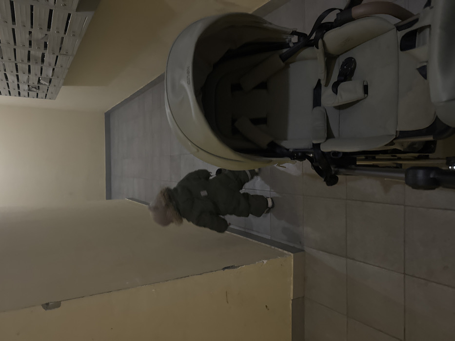 The image captures an indoor hallway or corridor within a residential building in Akulovo (Gp Kubinka), Russia, under dim lighting. A young child, appearing to be a toddler, is depicted walking away from the camera down the hallway towards the left side of the frame. The child is clad in a dark green padded jumpsuit with a fur-trimmed hood and light-colored footwear. In the foreground on the right, a beige baby stroller is partially visible, oriented with its empty seat and harness system facing the viewer. The hallway features light yellow/beige walls, a light grey tiled floor with darker grout lines, and a dark baseboard. On the right wall in the background, a grid of grey metallic mailboxes is mounted.