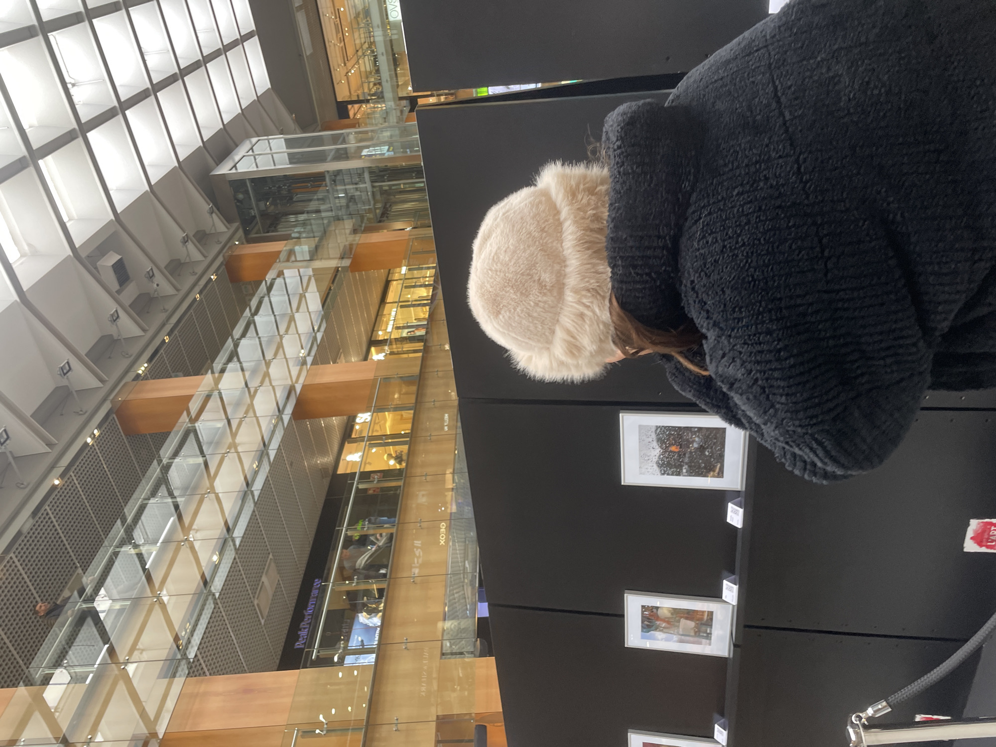 The photo is taken inside a multistory building in the city of Les Escaldes, Andorra. The foreground is dominated by a person wearing a fur hat and a black coat, standing near a display of framed artworks hanging on a black wall. In the background, a large building with a glass facade is visible, revealing multiple floors with shops, offices, or living spaces. The ceiling of the building features a geometric pattern of white panels and structural supports. A glass enclosed elevator is also visible within the structure.
