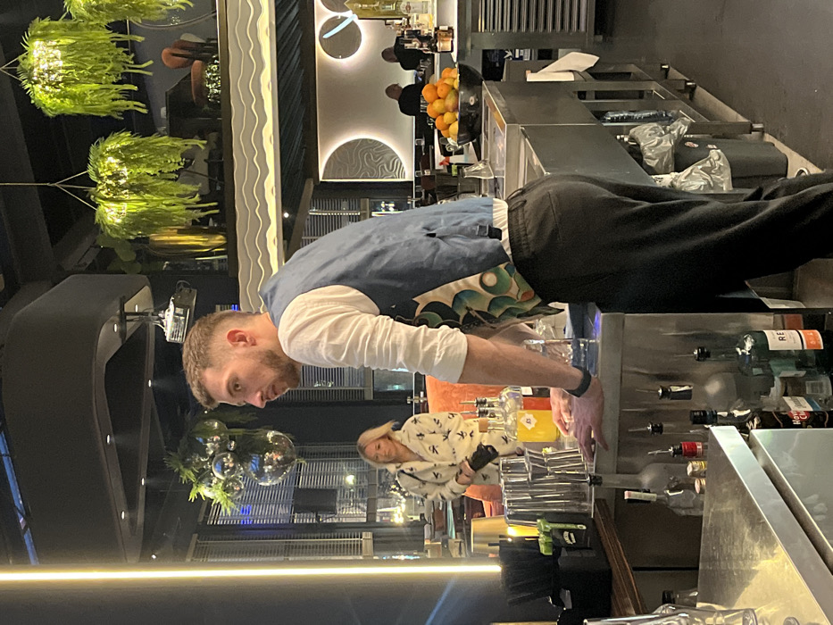 The image displays an interior view of a modern bar or restaurant located in Varna, Bulgaria. In the foreground, a male bartender with short light brown hair and a beard is positioned behind a stainless steel counter, leaning forward with his hands on the surface. He wears a white long-sleeved shirt, a blue vest featuring a circular abstract pattern on the lower back, and dark trousers. His gaze is directed towards the left, out of frame. The counter in front of him holds various liquor bottles, syrup dispensers, bar shakers, jiggers, and a black container of straws. Further back, to the left of the bartender, a blonde-haired female stands, holding a black camera in her left hand. She wears a light-colored, possibly cream, long-sleeved top with a repeating dark pattern. Behind her, cushioned seating and a table with a gold-colored lamp are visible. The background reveals contemporary interior design elements including a dark ceiling from which decorative green, fern-like artificial plants and reflective spherical ornaments are suspended. A prominent white, wavy architectural feature runs across the top of the bar area. Beyond this, a white wall displays illuminated, crescent moon-shaped abstract patterns. To the far right of the bartender, the stainless steel counter continues, holding a black bowl filled with oranges and lemons. Two indistinct male figures are seated at a table against the illuminated back wall. Vertical light strips provide ambient lighting on the left side of the scene.