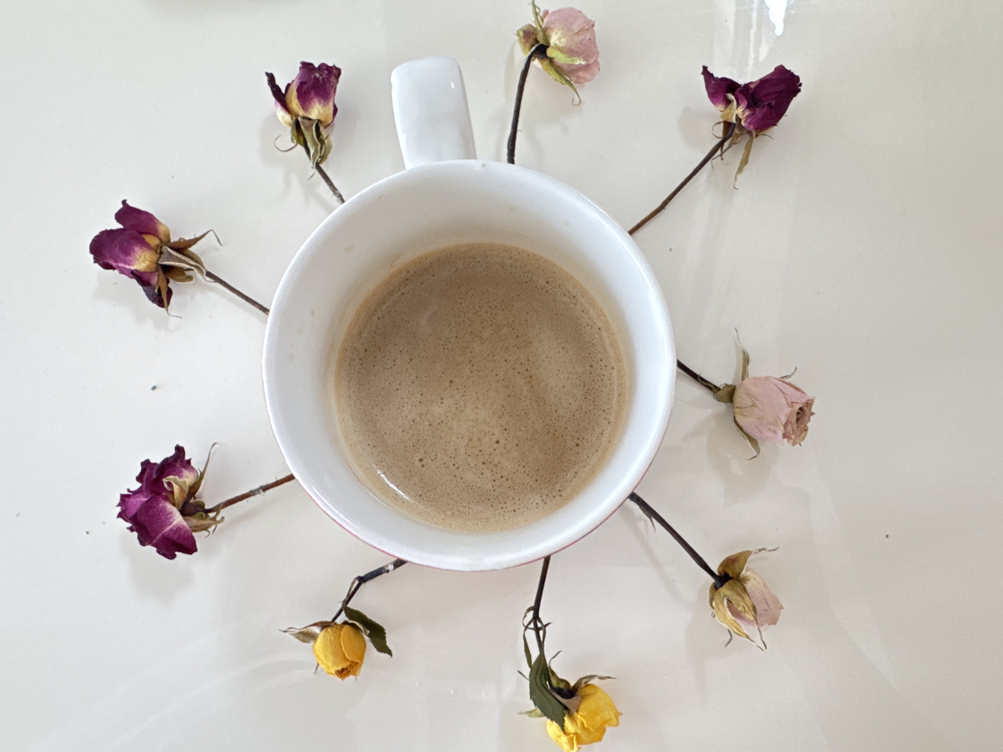 A top-down shot depicts a white ceramic cup, containing a beverage with a light brown, frothy surface, likely coffee or a coffee-based drink. The cup is surrounded by several dried rose buds, arranged in an approximate circular pattern around it. The roses vary in color, including purple, pink, and yellow hues. They appear to be placed on a smooth, glossy, off-white or light beige surface. There is no indication of the location being in Varna, Bulgaria.
