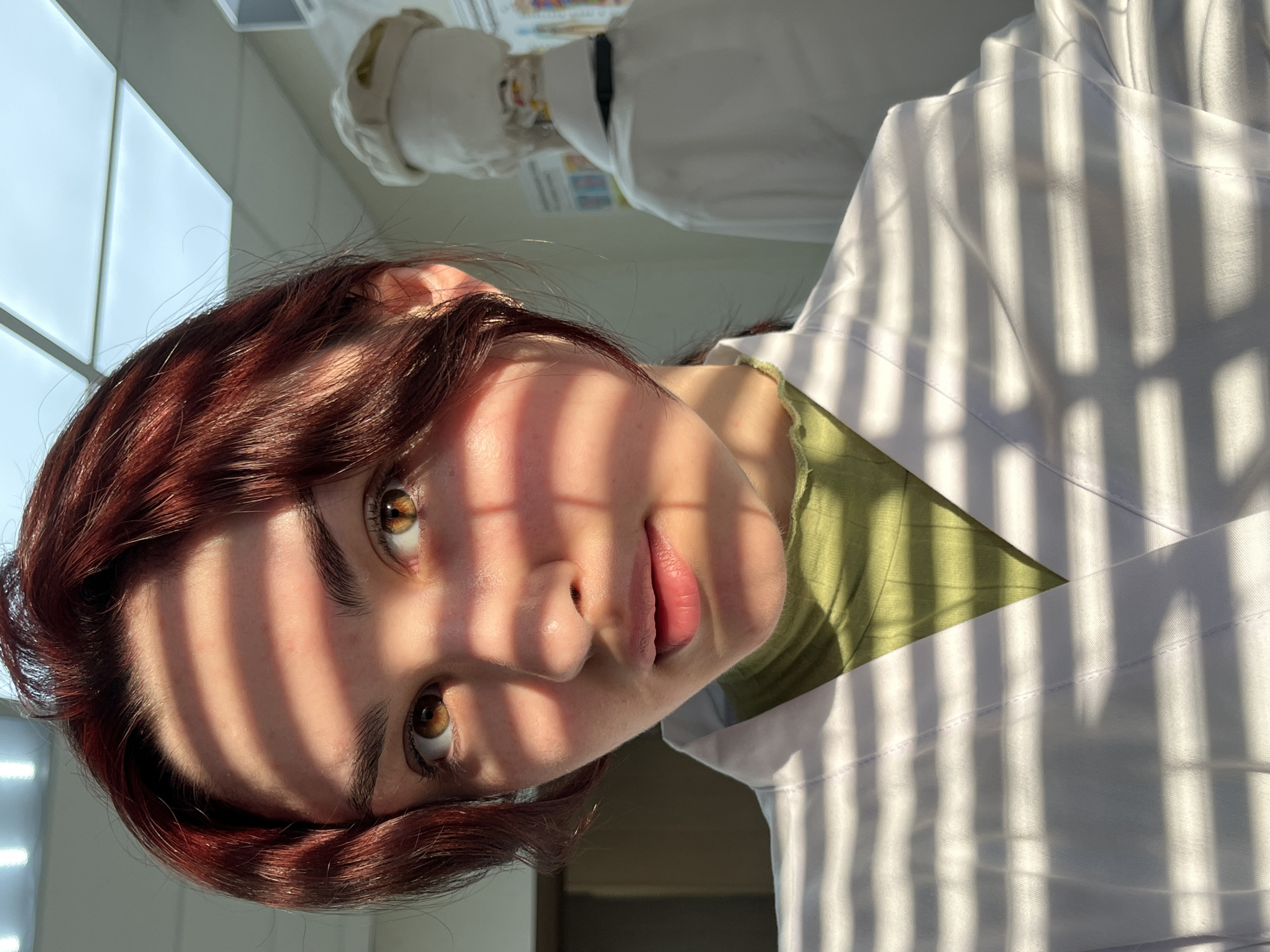 A close-up portrait depicts a young woman with auburn hair, fair skin, and light brown eyes. The subject is wearing a green top and a white lab coat. Her face is partially covered with vertical stripes of light and shadow, likely from blinds or a window shade. In the background, partially obscured and out of focus, is a mannequin wearing a white lab coat and chef's hat. The location is likely indoors, near a window with natural light, and possibly a science or culinary lab setting. There is no indication that this image was taken in Neftekamsk, Russia.