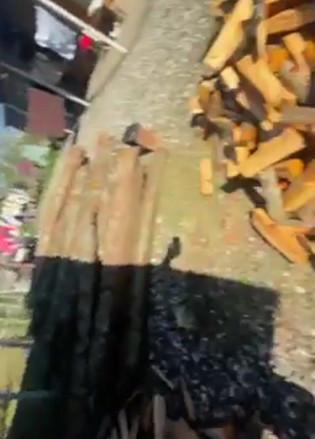 A man holding the camera films himself under a bright, sunny sky, with a building behind him. The camera then pivots to a pile of split logs and a large hammer, which he raises, swings, and uses to split one of the logs.