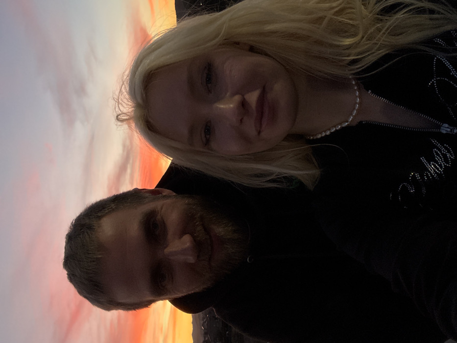 The image depicts two individuals, one male and one female, posing for a photograph outdoors at sunset