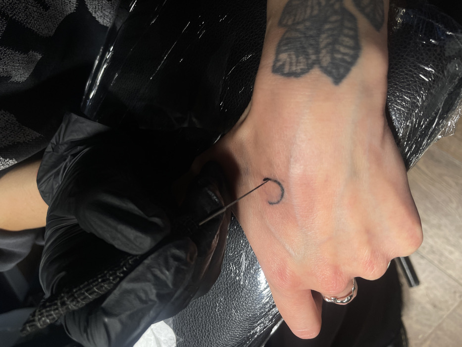 - "A close-up, overhead view depicts a tattoo artist performing a hand-poke tattoo on a client's right hand" by FM-x3j9a2, licensed under CC BY 4.0
