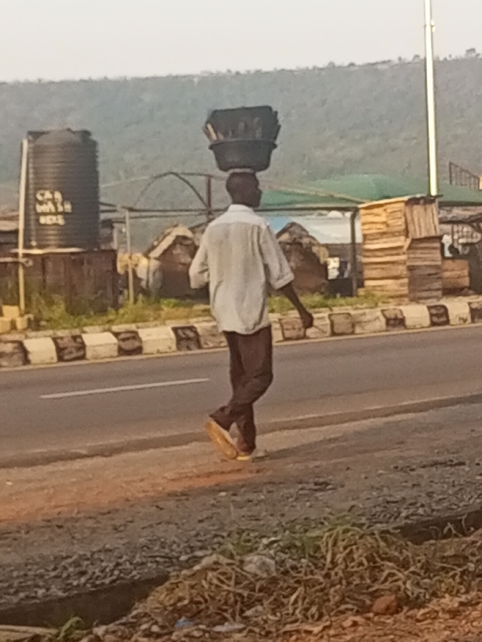 An outdoor, eye-level image captured during daylight in Zango-ndaji, Nigeria, depicts an adult male walking from left to right across the frame. The man, seen from behind, is wearing a light-colored short-sleeved collared shirt, dark trousers, and light-brown, flat footwear. He carries a large, dark-colored basin, seemingly filled with dark, irregularly shaped objects, balanced on his head. His right arm is slightly bent and positioned forward as he walks. He is traversing a dirt and gravel shoulder situated next to a paved road. The road features a visible white solid line separating lanes and is bordered by a median constructed from alternating black and white concrete blocks. In the mid-ground, behind the man, a black cylindrical water tank with "CAR WASH HERE" inscribed in white is visible on the left. To the right of the water tank, several informal structures constructed from materials such as wood planks and corrugated metal are present. A tall, slender pole extends vertically on the far right of the frame. The background features a distant, undulating range of green, tree-covered hills under a pale sky. The immediate foreground consists of dry, tangled vegetation and loose gravel.