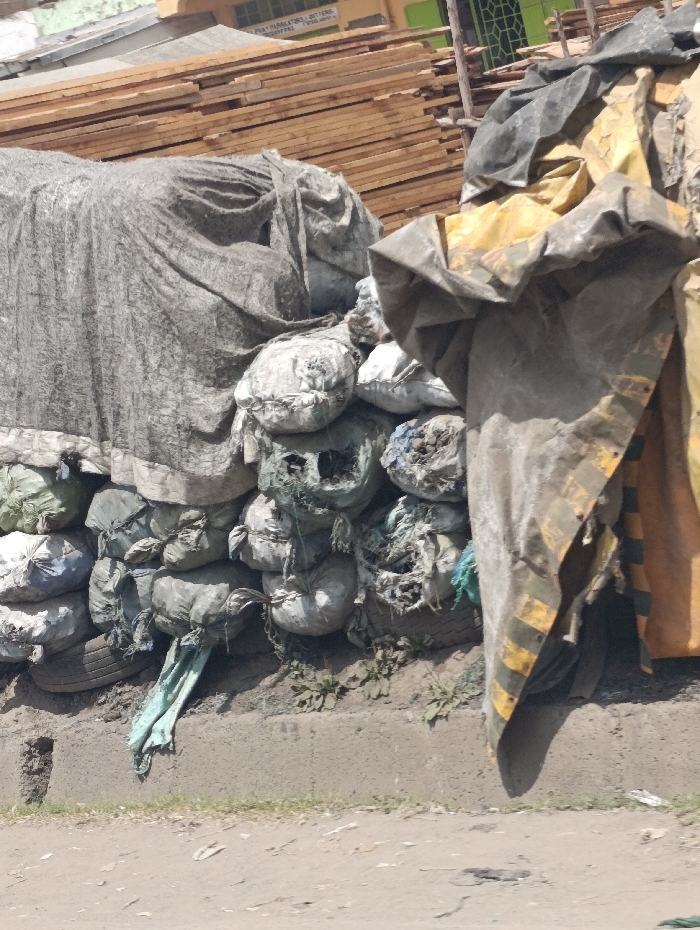 The image captures an outdoor scene in Matungulu west ward, Kenya, detailing a storage area adjacent to a dirt road