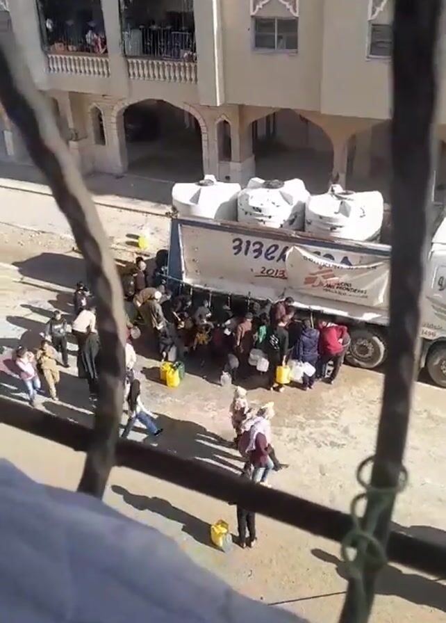 crowd of people gathered around a truck with large, white water tanks in its bed. The people are filling yellow and clear containers with water from the truck. The truck has writing on it that includes "DRINKING WATER" and "ACTION AGAINST HUNGER". The scene is shot from an elevated position, looking down through a wrought iron window. A multi-story building is visible in the background. The ground is a concrete or paved area. People are walking around carrying water containers. Some people are children. Shadows are visible, indicating that it is daytime.