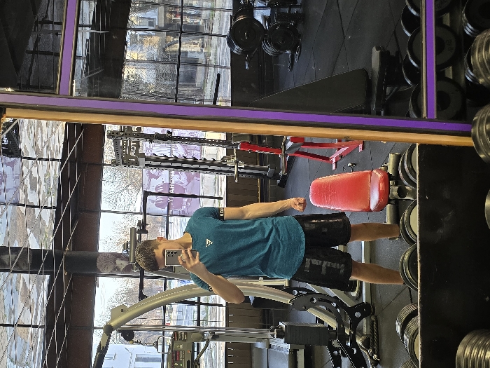 A male individual is depicted taking a mirror selfie inside a gym located in the city of Levski, Bulgaria