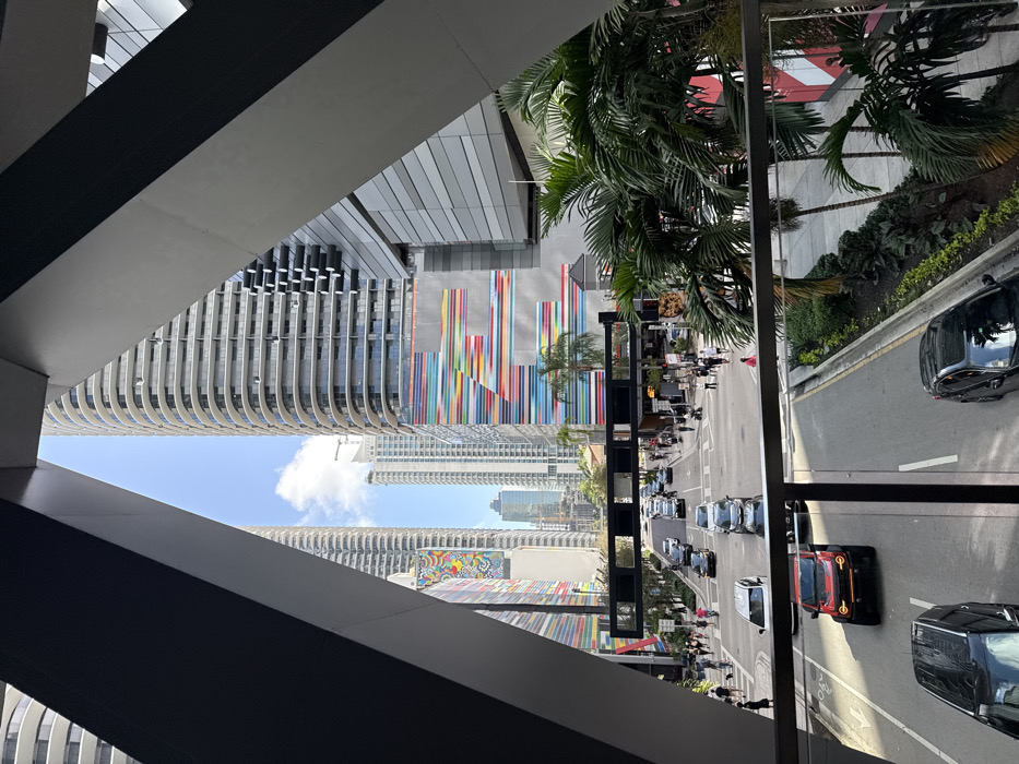 The image presents an elevated, downward-angled view of a bustling urban street in the Brickell district of Miami, Florida, United States, specifically from within or adjacent to Brickell City Centre. Dark grey, angular architectural beams of an overhead structure frame the upper and side portions of the scene, creating a central trapezoidal opening. A thin, dark horizontal railing runs across the lower foreground. The central focus is a multi-lane street, likely a segment of SW 8th Street, extending from left to right and receding into the distance. Vehicle traffic is present in multiple lanes; a red/orange Ford Bronco is prominent in the left foreground lane, followed by a dark SUV. Numerous other cars, including sedans and SUVs, occupy the lanes. White lane markings are visible on the asphalt. Sidewalks line both sides of the street, populated by multiple pedestrians. Approximately two dozen individuals are observed walking, standing, or crossing at an intersection further down the street. An overhead black rectangular structure, possibly for signage or part of a skybridge, spans horizontally across the street in the midground. The background is dominated by modern high-rise buildings under a clear, bright blue sky with scattered white clouds. To the right, a tall, light-colored skyscraper exhibits numerous curved balconies on its facade. To the left and center, a prominent building features a large, multi-story mural composed of stacked, colorful horizontal stripes (red, orange, yellow, green, blue, purple) against a grey background, interspersed with plain grey sections, identifiable as "The Movement" by Typoe at the EAST Hotel, Brickell City Centre. Additional skyscrapers are visible further in the distance. Lush green palm trees and tropical foliage are visible along the sidewalks and in planters, particularly on the right side. The scene is brightly illuminated by natural sunlight, indicating daytime.