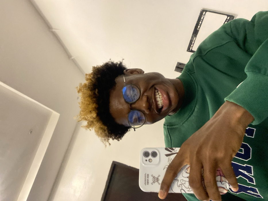 A dark-skinned individual, presenting with short, dark curly hair featuring light brown or blonde tips, is depicted in a close-up, chest-up selfie format