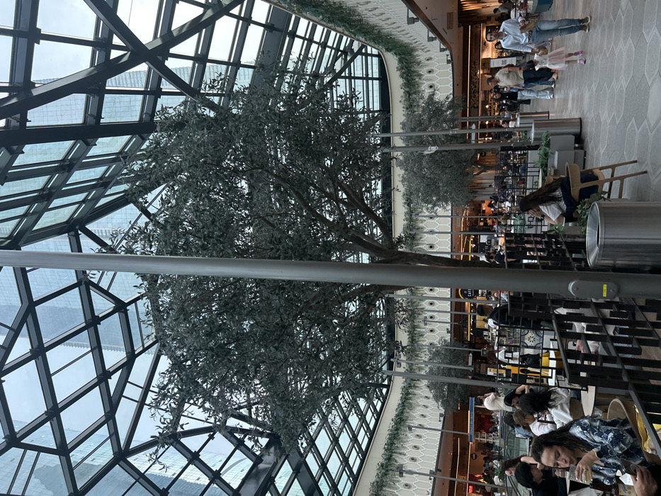 An interior wide shot depicts a bustling atrium or food court area within Antara Fashion Hall, located in Polanco, Mexico City, Mexico. The scene is dominated by a large, multi-trunked artificial tree with dense green foliage positioned centrally under a vaulted, geometric glass ceiling. This ceiling, composed of dark-framed glass panes, reflects the sky and several adjacent high-rise buildings, indicating an outdoor view above the structure. Below the glass ceiling, a multi-level environment is visible. The foreground shows a section of a restaurant or cafe area with various individuals seated at light-colored tables on a hexagonal-patterned tiled floor. To the left, a woman with dark curly hair, wearing a blue and white patterned top, is seated, drinking from a clear glass. A dark metal railing separates this dining area from a walkway. In the midground, numerous people are present. On the right, a man in a light blue shirt and jeans walks alongside a young child in a pink dress and shoes, holding a paper bag. Other individuals are seen walking or gathered near various establishments. The perimeter of the open space features a patterned wall with circular cutouts and vertical light fixtures, adorned with trailing green plants. Several smaller artificial olive trees are also placed throughout the area, alongside stainless steel trash receptacles. In the background, multiple restaurants and shops with illuminated signs and visible patrons line the upper level of the structure.