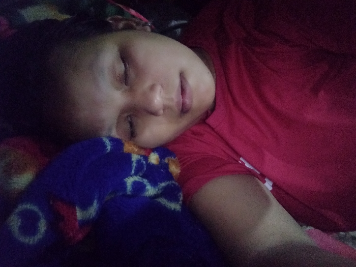 A single individual, with light to medium skin tone, is observed lying on their right side with eyes closed, indicative of sleep. They are dressed in a plain red short-sleeved shirt. The individual's head is resting on a blue fleece blanket or pillow, patterned with light-colored, abstract shapes. A secondary, multi-colored patterned fabric is partially visible underneath the blue item. The immediate environment is dimly lit. Location: City of Unknown, Unknown.