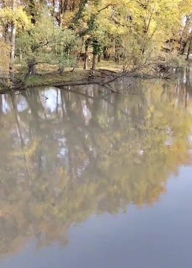 placid river bordered by trees. The water's surface mirrors the foliage, creating a symmetrical effect. The trees are predominantly deciduous, displaying a spectrum of autumnal colors. The weather is bright and sunny, providing strong illumination.