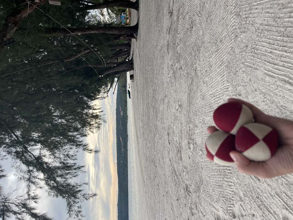 The image depicts a white sand beach in Preah Sihanouk, Cambodia, under an overcast sky. In the immediate foreground, a light-skinned human hand holds three spherical juggling balls. Each ball is segmented with alternating red and off-white fabric patterns. The beach sand displays distinct parallel raking lines extending into the midground. Beyond the sand, calm, light-colored ocean water stretches towards a distant, heavily vegetated landmass on the horizon. A line of tall, slender trees with drooping needles, consistent with Casuarina species, borders the right side of the beach. String lights with exposed bulbs are suspended between these trees. In the midground water, two small boats are visible near the shore, and a tree stump rests on the sand. A partial view of a blue building is discernible in the far background, positioned behind the trees on the right. No other identifiable human figures are present.