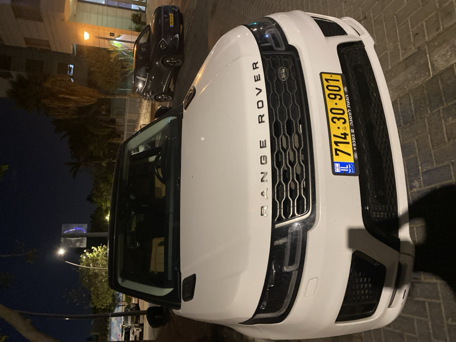 This nighttime image captures an urban street scene in Rishon LeZion, Israel. The primary subject is a white Range Rover SUV, observed from the front, parked on a patterned brick-paved surface. The vehicle exhibits an Israeli license plate, number 714-30-901, positioned centrally on the front bumper. Below the numerical sequence, Hebrew text "הגעת לספפה" and "+9393" is visible. The Range Rover features a prominent black grille with "RANGE ROVER" and "LAND ROVER" badging, and its interior appears to have light-colored upholstery. In the background, to the right of the Range Rover, a dark gray Kia Sportage SUV is parked on the street, partially visible, displaying an Israeli license plate number 298-60-205. Behind these vehicles, a multi-story modern building with several illuminated windows stands, accompanied by a single street lamp emitting an orange glow. Palm trees and other dense green foliage are present in the mid-ground and background. To the left, a tall street light pole is visible. No individuals are present or engaged in any actions within the depicted scene.