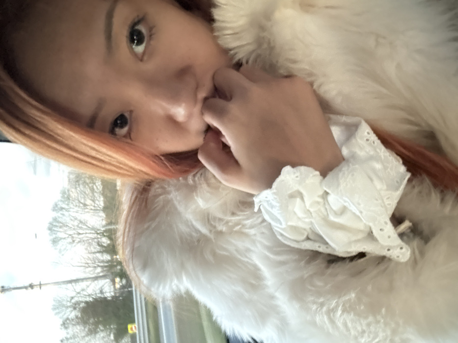 A woman with reddish-blonde hair, dark eyes, and freckles is partially visible. She is wearing a fluffy white fur coat and a white blouse with lace detailing. Her hand is near her face. A window is in the background, showing a blurred landscape with trees and a utility pole. The image is rotated counter-clockwise, giving a tilted perspective.