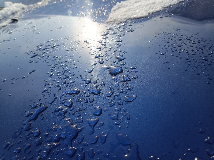 The scene depicts a close-up view of a dark blue metallic surface, likely the exterior of a vehicle, located in Посад, Russia. The surface is covered with numerous irregularly shaped water droplets of varying sizes, which exhibit bright specular reflections from an overhead light source, presumably the sun. A distinct, irregular band of white snow runs along the upper left portion of the metallic surface, partially melted, indicating a recent or ongoing thaw. The background is out of focus, showing blurred bright areas consistent with an outdoor environment under sunlight. No individuals, specific actions, or direct interactions are visible. The primary subjects are the textured metallic surface, water droplets, and snow accumulation.