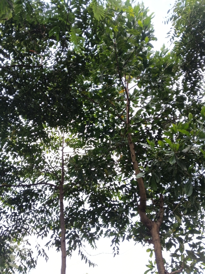 The image depicts an upward view into a dense canopy of trees within a green space in Chengdu, China. Multiple tree trunks, dark brown in tone, rise vertically, partially obscured by the overlying foliage. The canopy consists of numerous green leaves, exhibiting varied shapes; some appear finely textured and compound, while others are broader and simpler. A bright, overcast or hazy sky is visible through the gaps in the leaves, creating a backlit effect. No human subjects, animals, man-made structures, or discernible actions or interactions are present. The specific location within Chengdu is not identifiable from the visual evidence provided.