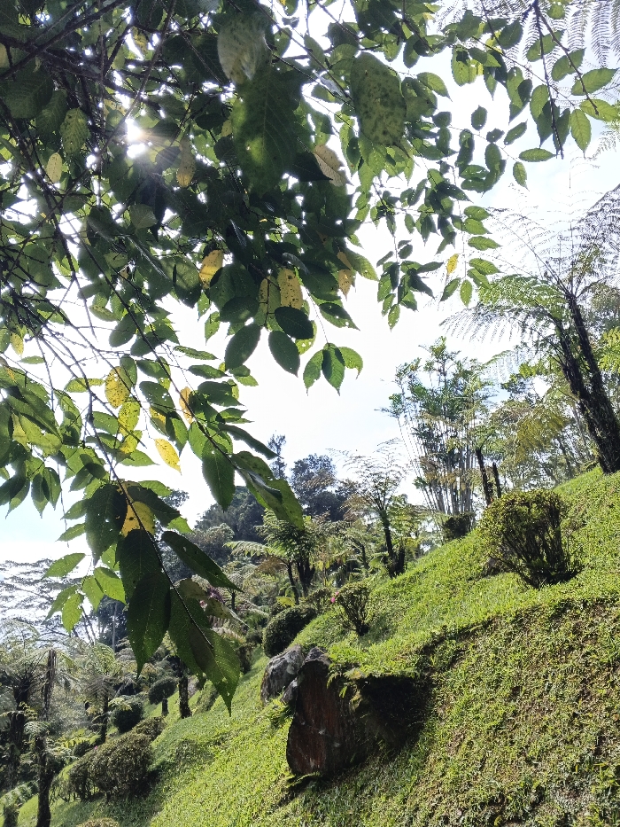 This image depicts a vibrant, lush green hillside scene within the city of Soibada, East Timor, viewed from a low angle looking upwards. The upper left portion of the frame is dominated by the dense canopy of a tree, with numerous green leaves, some showing yellowing, silhouetted against a bright, clear sky. Sunlight streams through these leaves, creating visible rays and bright spots. The foreground and midground consist of a steep, upward-sloping expanse covered in short, intensely green grass. Scattered across this slope are several dark, irregularly shaped rocks, some exhibiting patches of moss. Numerous small, dense, dark green bushes are interspersed among the grass. Further up the slope and towards the right, taller plants are visible, including several slender tree ferns with distinctive fronds and what appear to be tall bamboo shoots. The background consists of a dense cluster of trees and foliage under a bright sky. No people, animals, or artificial structures are present in the scene.
