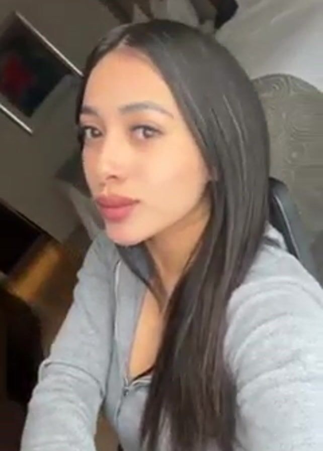 young woman with long, straight, dark hair, wearing a gray zippered sweatshirt. She is sitting in a chair, and a bed is visible in the background. She is looking at the camera and moving her head slightly.