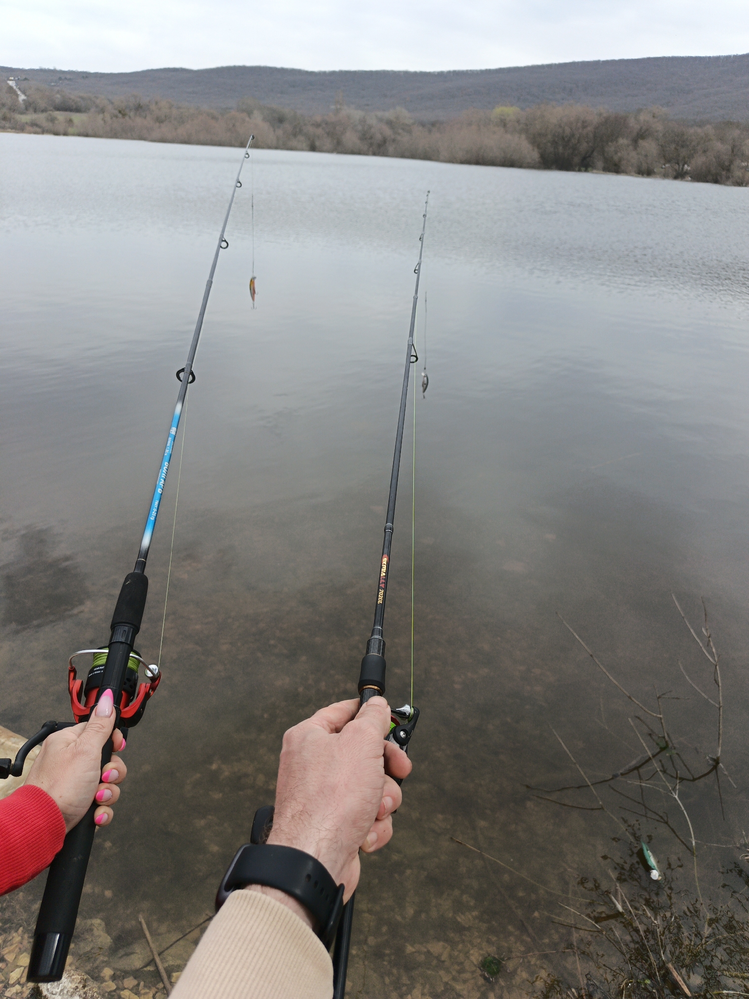 Two people are fishing at a lake on an overcast day. One person, wearing a red sleeve, holds a blue and black fishing rod. The other, wearing a tan sleeve and a black watch, holds a black and orange fishing rod. The lake is surrounded by trees, with mountains in the background. There are sticks and debris in the shallow water near the shoreline. The location is possibly in the Орлиновский округ, Ukraine, based on geographic features.
