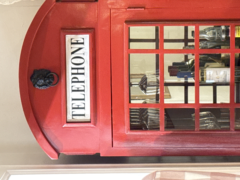 A red telephone booth, repurposed as a decorative cabinet, is partially visible