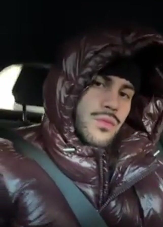 A man is seated in a car, wearing a dark, shiny, puffy jacket with the hood up and a black beanie. He is wearing a seatbelt. The man looks directly at the camera, moves his head slightly, and briefly smiles. The car appears to be in motion, indicated by blurred lights visible through the window. The interior of the car is mostly black.