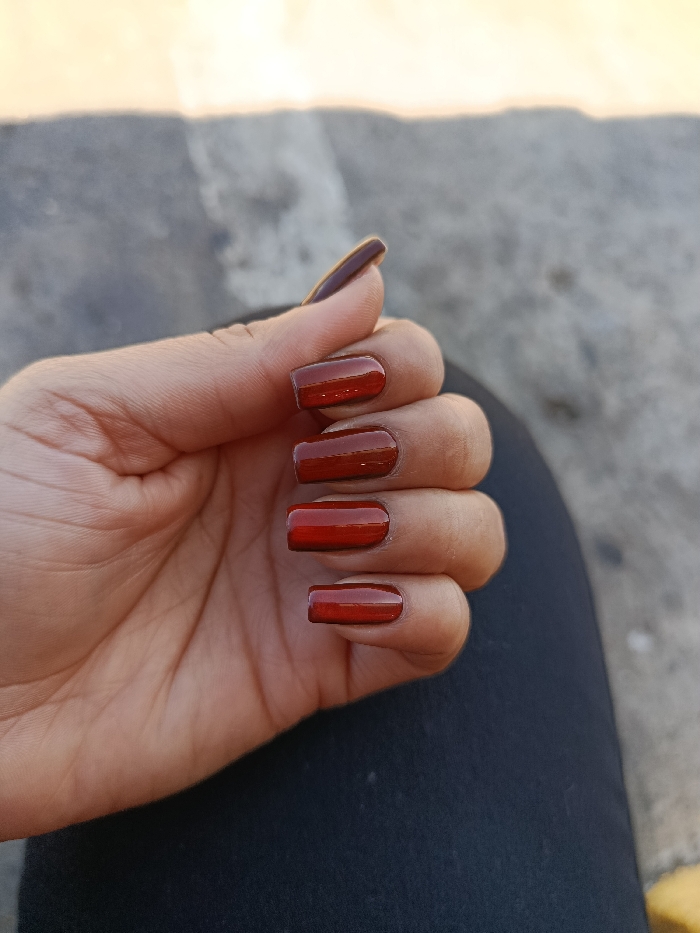 - "A hand with square-shaped nails painted in a glossy, deep red-brown polish is shown" by FM-njJde2, licensed under CC BY 4.0