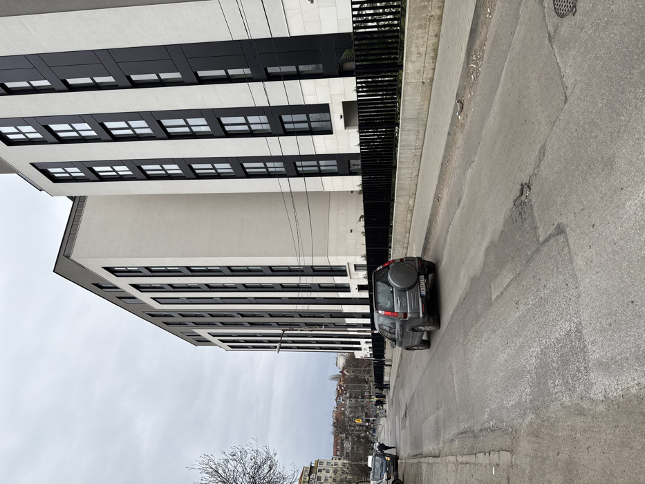 The image depicts an urban street scene in Sofia, Bulgaria, under an overcast sky. The location is an urban street identifiable by the Bulgarian license plate "CA 3472 RC" on a visible vehicle, indicating Sofia city. To the right, two modern, multi-story buildings dominate the frame. These structures feature light-colored, possibly off-white or beige, facades contrasted with vertical dark (black) panels containing numerous windows arranged in a grid pattern. The buildings have flat or slightly sloped dark roofs. A black vertical-slat metal fence separates the properties from an elevated concrete sidewalk. In the midground, a grey four-door SUV, appearing to be a Honda CR-V, is positioned on the asphalt road, facing away from the viewer. It has a spare tire mounted on its rear hatch. The road surface is visibly worn, characterized by numerous patches, cracks, and potholes, particularly prominent in the foreground. On the left side of the street, bare tree branches are visible in the foreground. Further down the street, indistinct human figures are walking on a sidewalk. A white utility van is parked on the left side of the road, behind the pedestrian figures. In the distant background to the left, older, less defined urban buildings are present, along with what appears to be a yellow traffic signal or street sign. Overhead utility lines traverse the mid-air, connecting poles or buildings. A street light pole is partially visible on the left side of the road, beyond the SUV. No direct interactions between individuals or vehicles are actively observed.