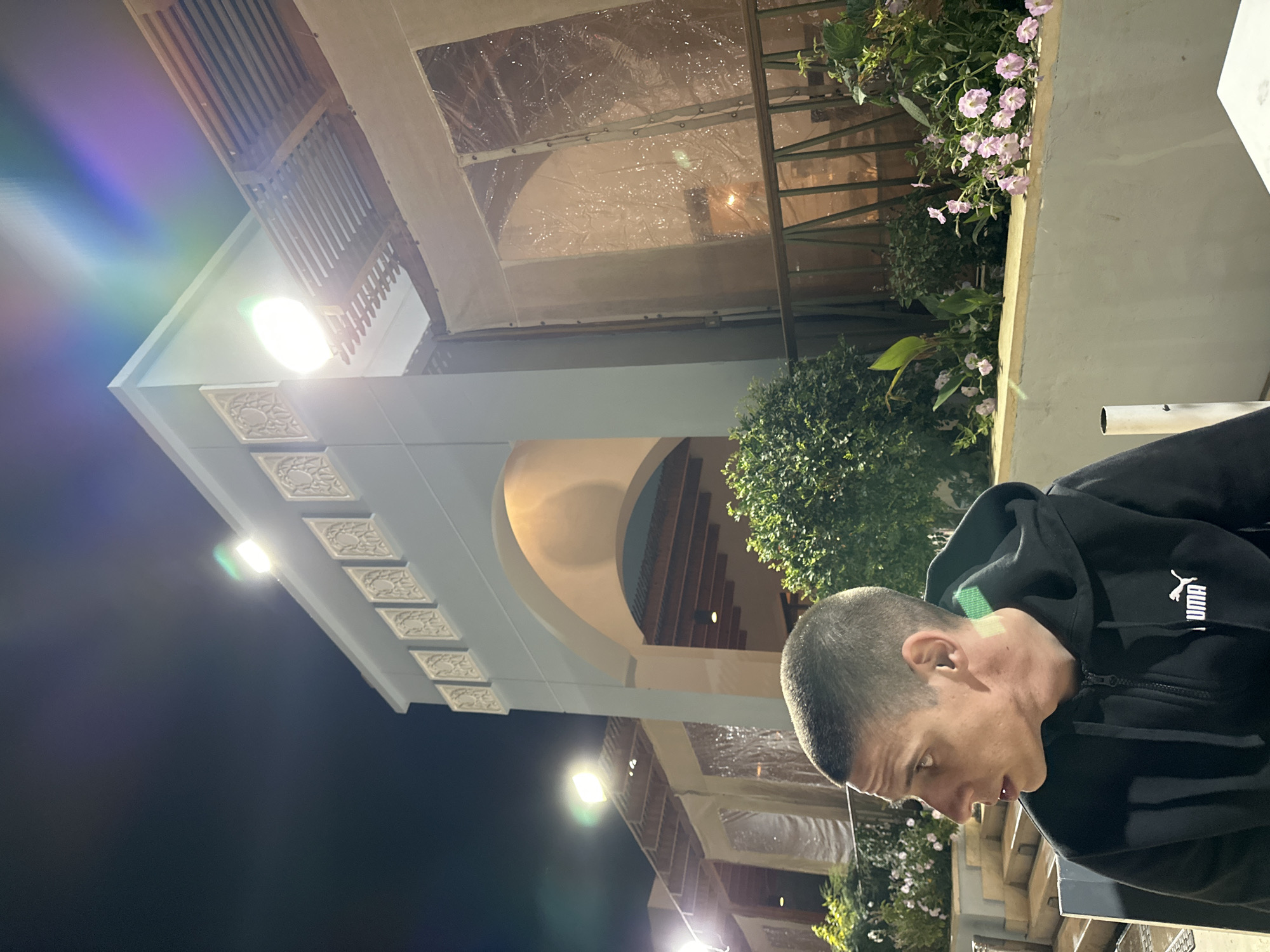 The image depicts a nighttime outdoor scene in the city of Unknown, Egypt, featuring a male individual in the foreground with a building in the background. The subject is a male with a short buzz cut, fair skin, and an earbud in his right ear. He wears a black zip-up hoodie with a white Puma logo on the right chest. He is positioned in a mid-shot, looking towards his left (viewer's left) with his mouth slightly ajar, suggesting observation or listening. A corner of a white surface, possibly a table, is visible in the lower right foreground. To the subject's left, light-colored steps are visible amidst green foliage. In the background, a multi-story building with a light-colored facade (grey/beige) is prominent. The building features a large central archway and an upper section adorned with five distinct square decorative panels, each displaying an intricate, possibly geometric or floral, pattern. Multiple bright white floodlights are affixed to the building, illuminating the scene and causing lens flare artifacts in the upper sky. Sections of the building feature wooden slatted awnings or pergolas. To the right of the archway, an outdoor seating area or extension is visible, enclosed by clear, crinkled plastic sheeting supported by a light-colored frame. A brown railing is present in front of this enclosed area. Green shrubs and planters containing small pink flowers are visible along a low wall in the middle ground, separating the foreground from the building. The sky is dark, indicating night. The overall environment is brightly lit by artificial sources.