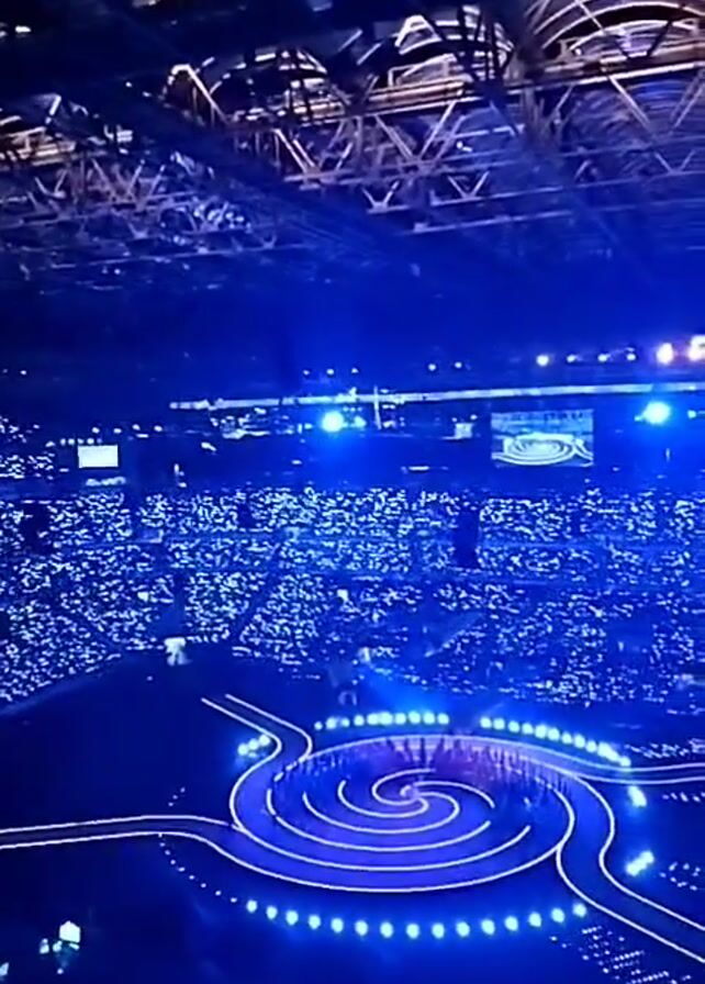 An overhead shot of a large stadium, packed with people, bathed in blue light. The audience is holding up lights, creating a sea of illumination. At the center of the stadium, there is a circular stage with a spiral design illuminated by blue lights. Overhead, a large screen displays visuals. The stadium’s structural supports are visible above the audience.